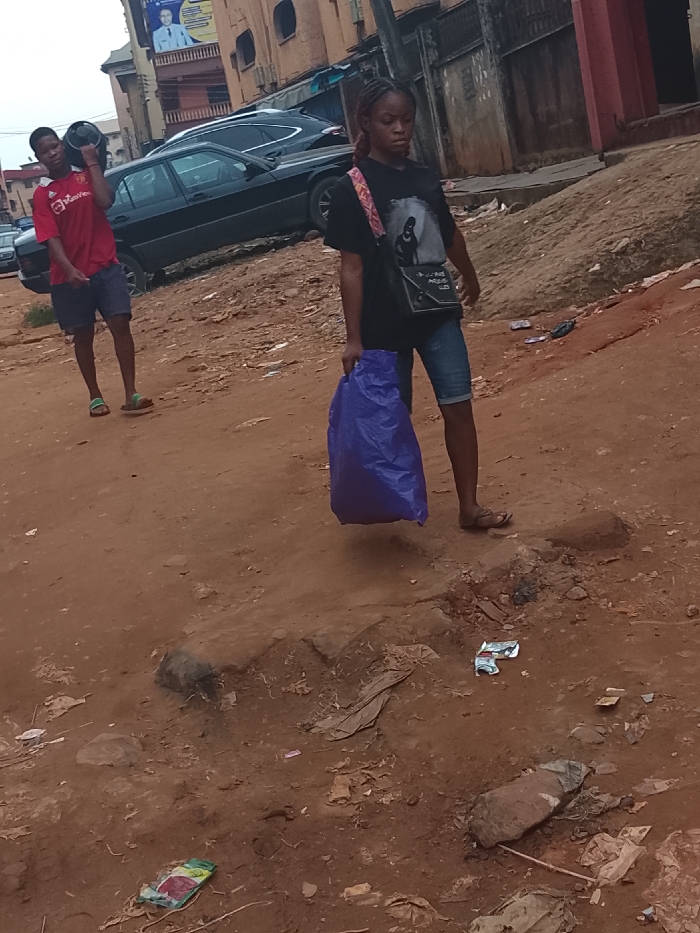 The image depicts an unpaved, reddish-brown dirt road in an urban area of Onitsha, Nigeria. The ground is uneven, eroded, and scattered with various forms of litter, including plastic wrappers and debris. In the right foreground, a young female with braided hair walks towards the left. She wears a black t-shirt with a white graphic print, denim shorts, and brown flip-flops. A black cross-body bag with a multicolored, patterned strap is slung over her right shoulder. She carries a crumpled purple plastic bag in her left hand. Her facial expression is neutral, and her gaze is directed slightly downward and to the left. In the left midground, a young male walks away from the camera. He wears a red short-sleeved t-shirt with a visible "TeamViewer" logo, dark shorts, and green and yellow flip-flops. He carries a black helmet on his right shoulder, held by his right hand. His head is turned slightly to his right. Behind the individuals, several vehicles, including a black sedan, are parked on a sloped section of paved road. Further back, multi-story buildings with faded facades and visible windows line the street. A large yellow banner or billboard featuring a portrait of a man in a suit is affixed to one of the buildings. The sky appears overcast. The two individuals are walking independently, exhibiting no direct interaction.