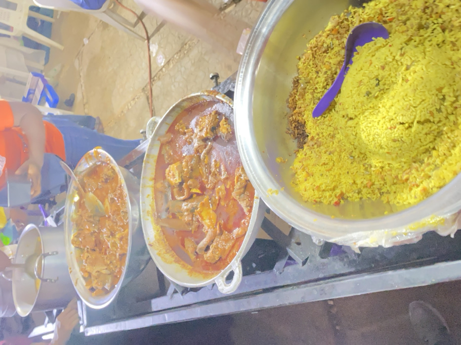 The image displays a food service setup in Rido, Nigeria, featuring multiple large containers of cooked food