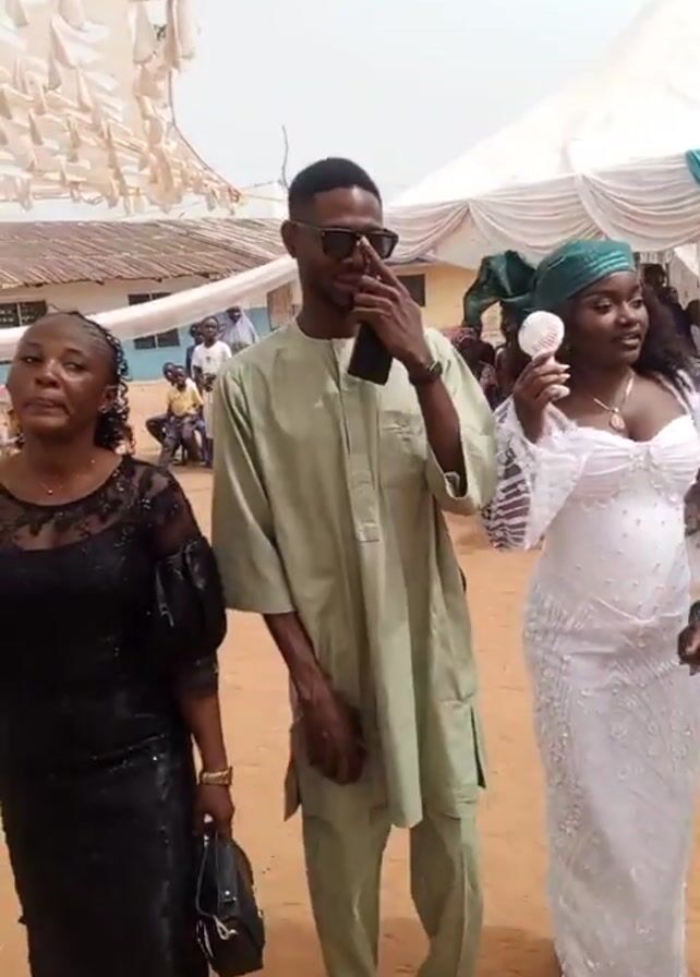 The video captures a lively outdoor celebration, likely a wedding reception, with guests dancing and enjoying the festivities. The ground is sandy and the event is sheltered by white tent-like structures with billowing fabric decorations above. The first shot shows a man in sunglasses and a light green traditional outfit standing next to a woman in a white, fitted dress and green headwrap, she is holding a small white flower. Another woman, in a black dress, stands to their left. The camera then shifts, still focusing on the dancing, to include a man wearing a black cap and a blue-and-white tie-dye outfit who is also dancing next to the woman in the black dress. In the background, people are seated under a building’s awning, suggesting a mix of social and formal settings. The atmosphere seems jovial, with everyone participating in the celebration.