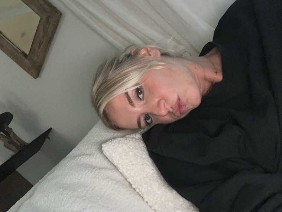 A fair-skinned woman with blonde hair lies on a white, textured pillow and blanket, wearing a black sweatshirt