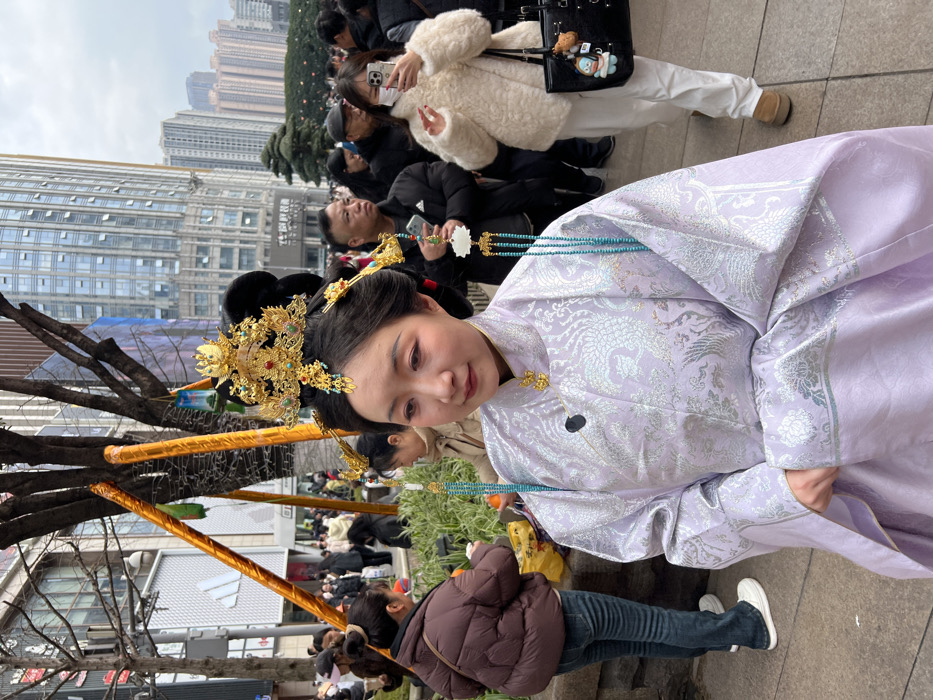 A woman in a traditional lilac dress with silver phoenix patterns stands outdoors. She wears elaborate gold and turquoise hair ornaments. Turquoise beaded strands hang from her hair to her dress. The background shows a city street with buildings, bare trees wrapped in gold material, and a crowd of people, some taking pictures.