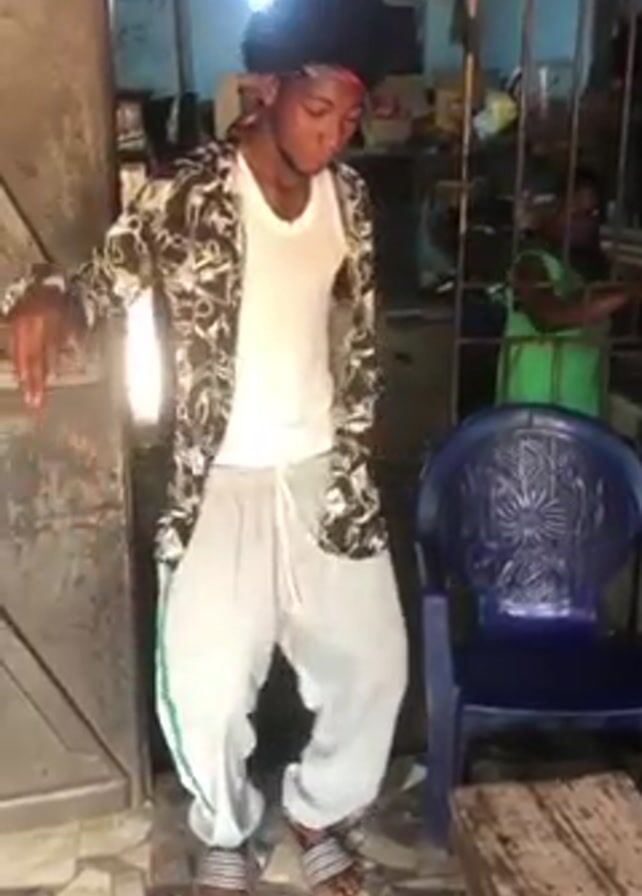 A young Black man wearing a white t-shirt, a black and white patterned jacket, grey sweatpants, and sandals stands in a doorway. He has an afro and a headband. He is looking directly at the camera. To the right of the man is a blue plastic chair and a small wooden table. Behind the man, through a barred window, a young woman wearing a green dress is visible. The room appears to be in a somewhat dilapidated or impoverished setting. The floor is tiled. The lighting is dim. The man slightly moves his arms and adjusts his posture.
