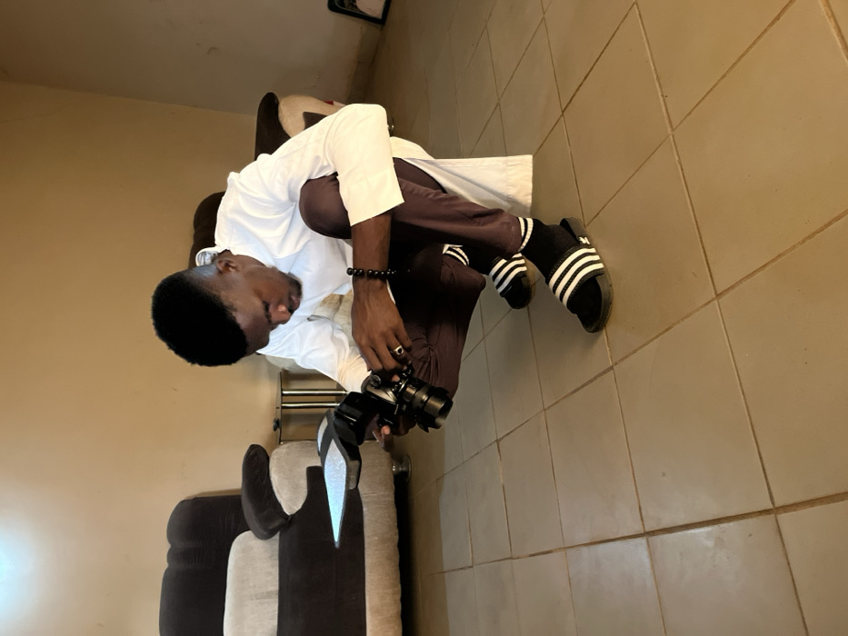 A male subject with dark skin and a short dark fade haircut crouches in an indoor setting in Kuru Dungus, Nigeria