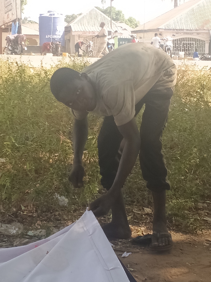 A young dark-skinned male, wearing a light-colored short-sleeved t-shirt and dark trousers with a side stripe, bends forward, looking directly at the camera. His right foot is bare, while his left foot wears a dark sandal. He manipulates a large piece of white material spread on the dirt ground in front of him. Behind him, dense green-yellowish vegetation borders a paved road. Across the road, in the city of Doma, Nigeria, a blue water tank labeled "APC DOMA" stands near parked motorcycles. Further along the street, a building with a light-colored roof displays "LIGHT OF GOD," and another building is marked with "AJUDUMENT MEMORIAL TAKKAMA" and "2023." Several individuals and additional motorcycles are visible in the background, suggesting routine street activity under daylight conditions.
