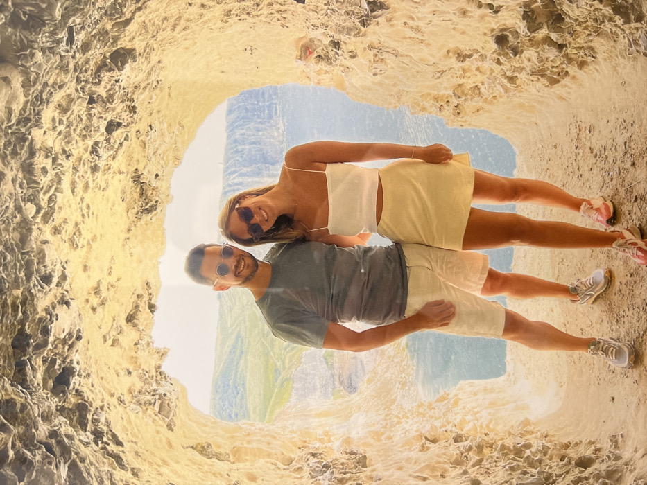 The image displays two individuals, a male and a female, standing inside a natural grotto or cave opening, posing for a photograph