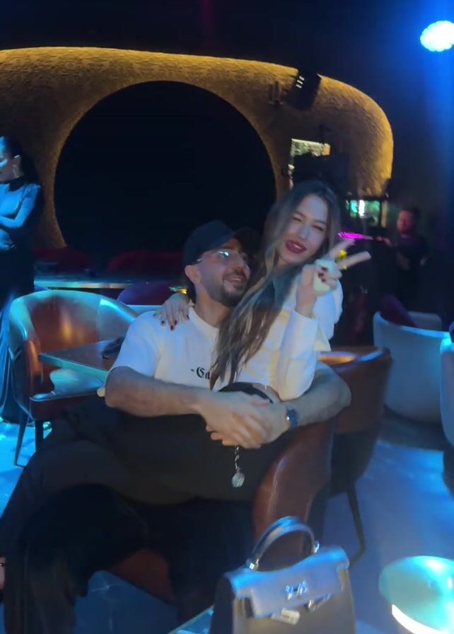 A man and a woman are sitting in a lounge chair in a nightclub. The man is wearing a white T-shirt, black pants, and a black baseball cap. The woman is wearing a white blouse and black pants. She is sitting on the man's lap and has her arms around him. She is holding up a peace sign with her fingers and sticking out her tongue. The man is smiling and looking at the woman. There is a purse on the table in front of them. Behind them is an ornate wall with a large round opening. Other people are in the background, including a woman in a black dress taking a photo with her phone. The nightclub is dark with blue lighting.