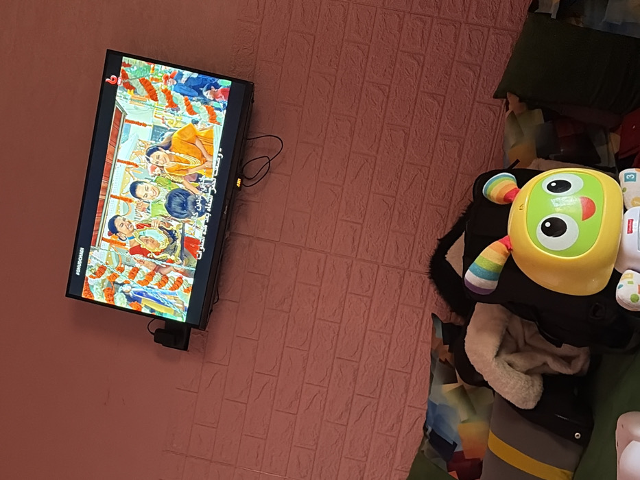 A TV screen displays a vibrant Indian drama. Adjacent to the television, various objects sit atop a cushioned surface. There’s a yellow and green baby toy with rainbow-colored appendages, a black purse with white fur lining, and other assorted items. The wall behind the TV features a textured, salmon-colored brick pattern.