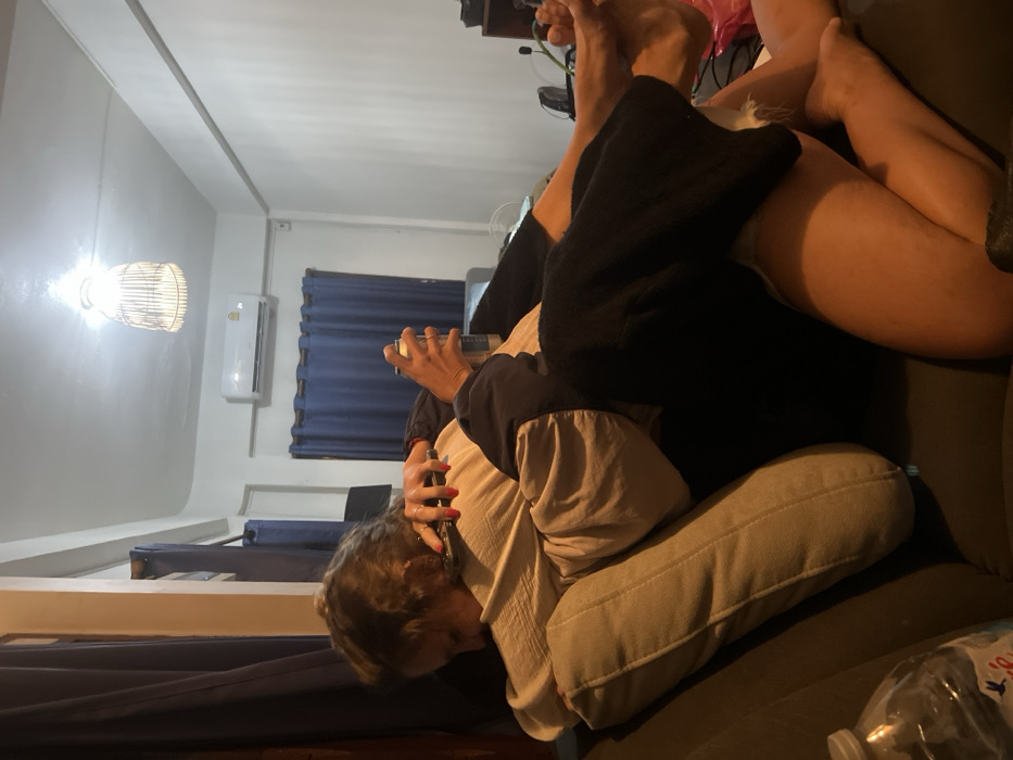 A person lies sideways on a sofa, legs elevated with bare feet. They wear shorts, a light-colored top, and a black jacket. They hold a phone to their ear, and another rectangular object in their hands. The background reveals a wall-mounted light fixture, an air conditioning unit, and a blue curtain. A water bottle sits on the couch.