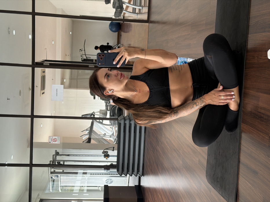 A woman in a black sports bra and leggings is seated on a yoga mat indoors. She holds a phone to take a selfie. Her hair is pulled back in a ponytail. A water bottle rests nearby. The background shows a fitness center with exercise equipment, mirrored walls, and black framed windows. The floor is wooden.