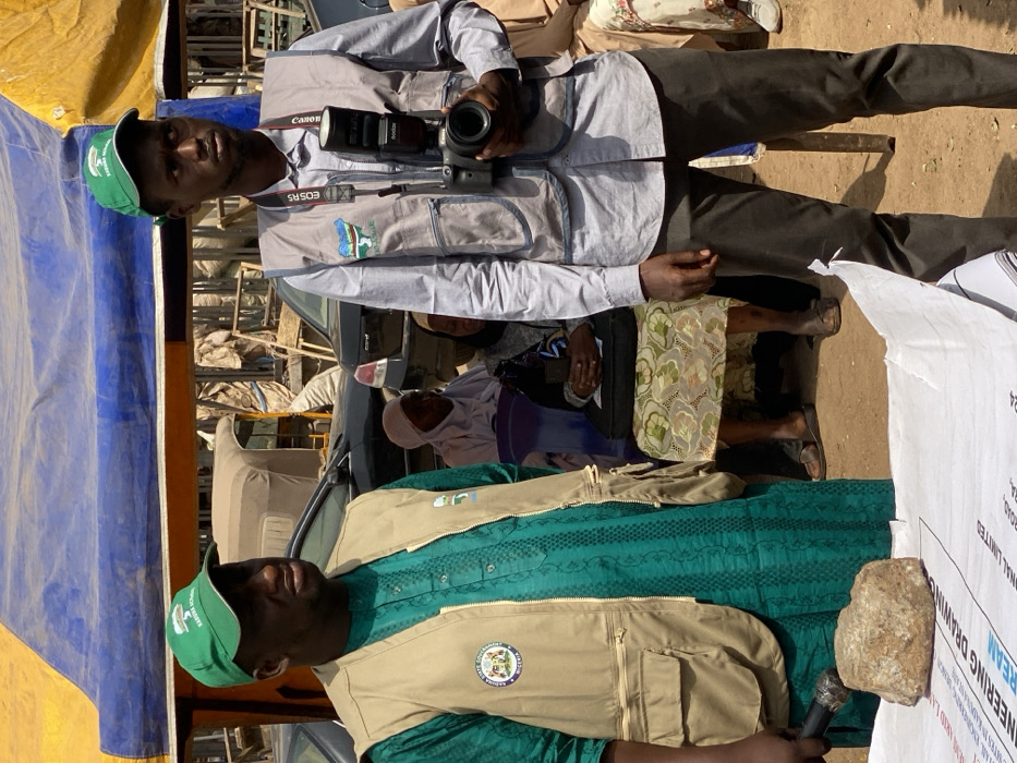 The scene depicts an outdoor gathering in Kawo, Nigeria, under bright daylight with a blue and yellow striped tarp overhead