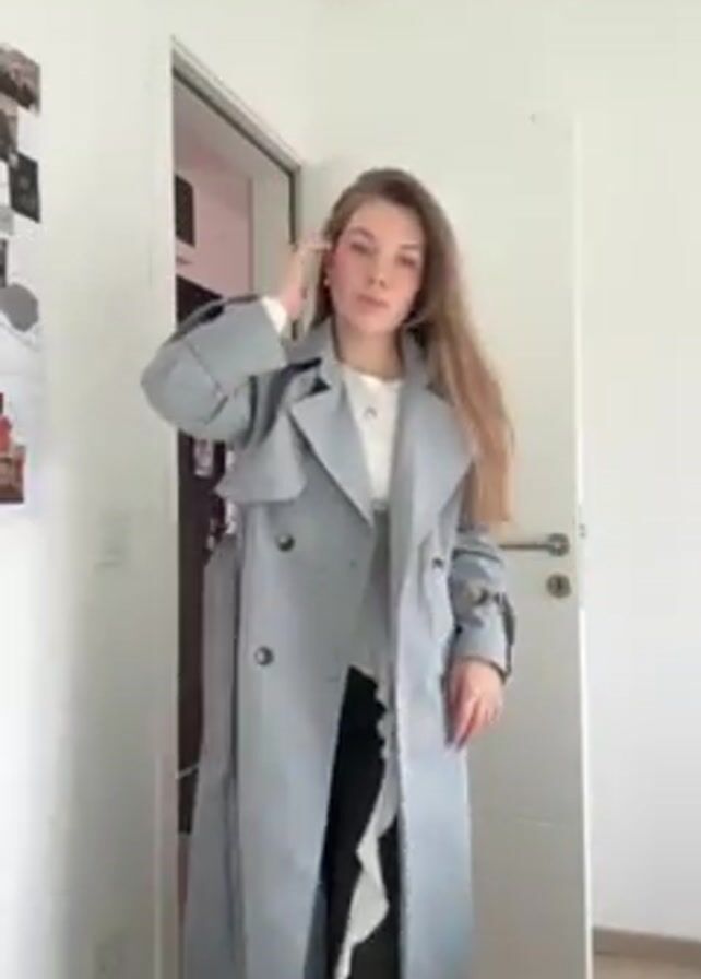 A young woman stands facing the camera in a bright, well-lit room. She's wearing a long, light blue-gray trench coat over a white top and dark pants. The coat is unbuttoned at first, then she buttons it. She then loops the belt and places her hands in her pockets. She has long brown hair. Behind her is a white door, a light switch, and a wall with photos and drawings taped on it. A dark doorway is partially visible to her left. The floor is a light brown color. There is music playing in the background.