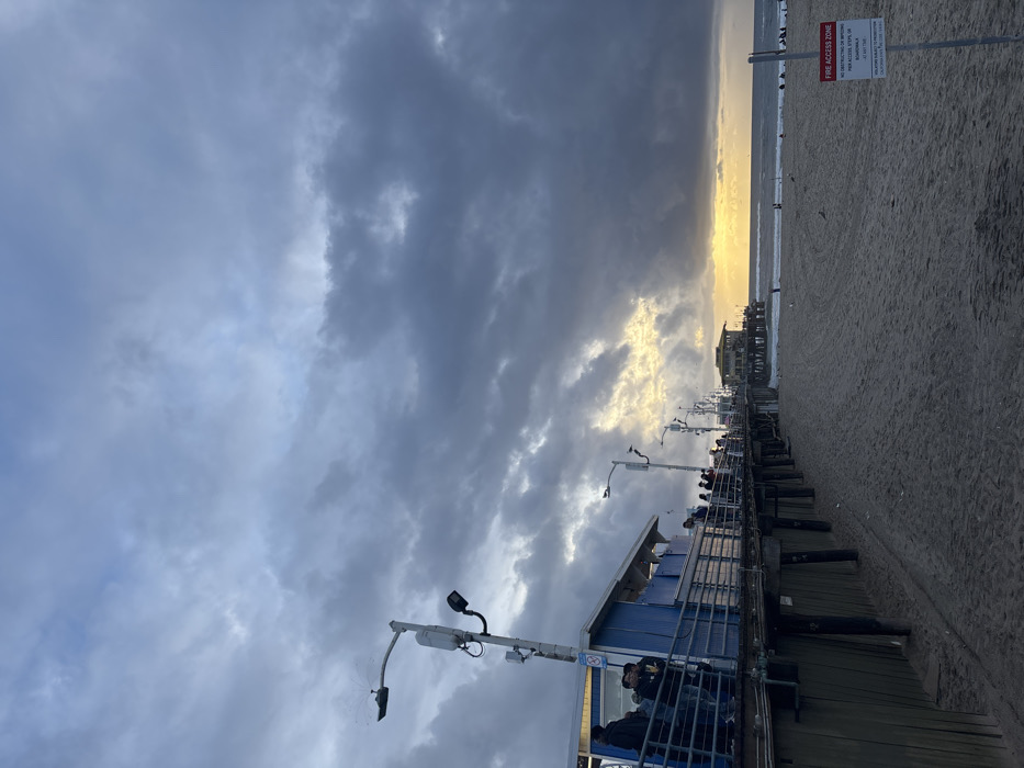 A pier stretches out towards the ocean under a dramatic sky. Heavy, gray clouds dominate the scene, with a sliver of bright sunlight peeking through near the horizon. The pier's infrastructure includes railings, lights, and a small blue building. People can be seen along the pier. A sandy beach runs parallel to the pier, marked with a fire access zone sign. The overall atmosphere is moody and serene.
