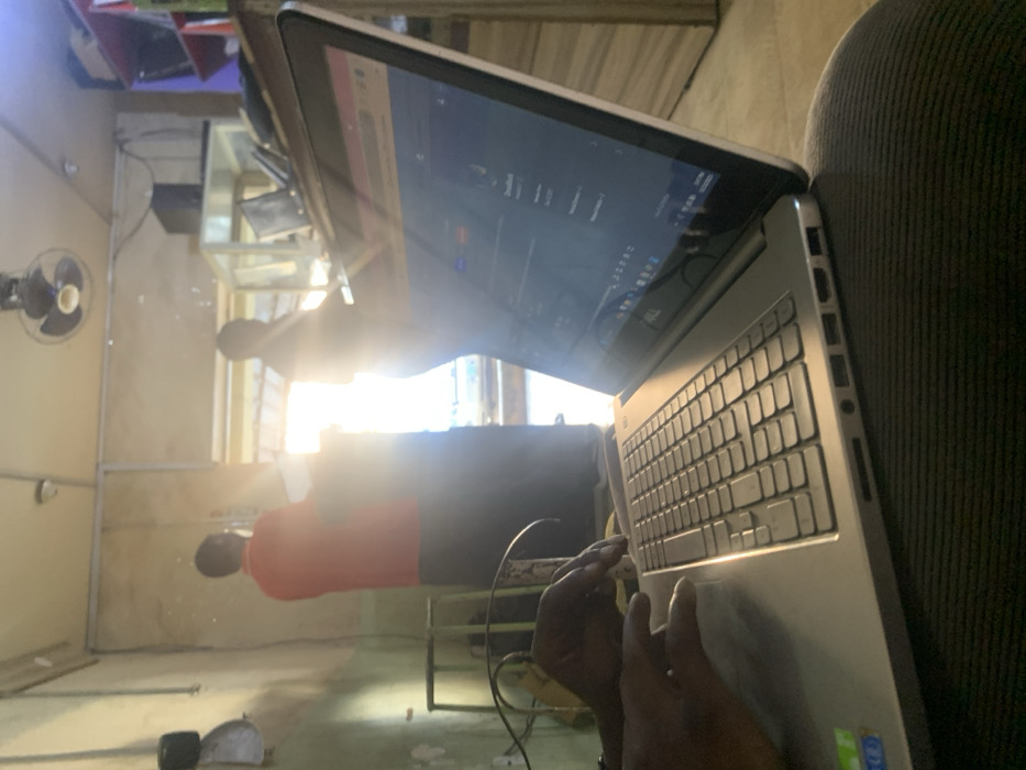 The image depicts an indoor scene in Jos, Nigeria. In the immediate foreground, a pair of dark-skinned hands operates a silver Dell laptop, which rests on a dark, textured surface. The laptop's screen displays a dark-themed communication application. In the midground, two individuals are silhouetted against bright sunlight emanating from an open doorway. One individual, wearing an orange shirt and dark trousers, faces away from the camera. The second individual stands to the right, adjacent to a counter with a glass display case. The room features worn, light-colored walls, a mounted ceiling fan with dark blades, and shelves containing electronics on the far right. A small, dark object, possibly an electrical component, is mounted on the left wall.