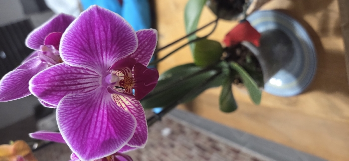 A vibrant purple orchid, defined by dark stripes on its petals, is the focal point. Its delicate structure and complex inner details are showcased. Positioned behind the orchid is an out-of-focus potted plant, with green leaves and a hint of red, resting on a wooden surface. A blue and grey striped saucer is visible beneath the pot. The background suggests an indoor setting, with a light-colored wall and glimpses of other objects. The overall image emphasizes the orchid's beauty through a combination of color, texture, and depth of field.