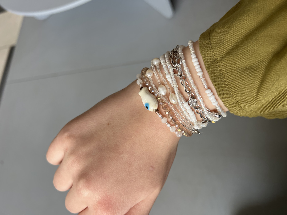 The image displays the left wrist and lower forearm of an individual, angled from above. The visible skin is light-toned. Approximately ten to twelve bracelets are stacked on the wrist. These bracelets consist of various materials: small round beads in white, clear, and translucent amber hues; irregular white freshwater pearls; and silver-colored metal chains, some incorporating infinity symbol links and star-shaped charms. A prominent, white, fish-shaped bead with a distinct blue "evil eye" symbol is visible among the upper bracelets. A section of an olive-green long-sleeved garment covers the lower portion of the forearm. The background is out of focus, presenting a plain, light grey surface behind the wrist and a blurred white object with a curved edge on the right. No discernible environmental or architectural features are present to identify a specific location within Sofia, Bulgaria.