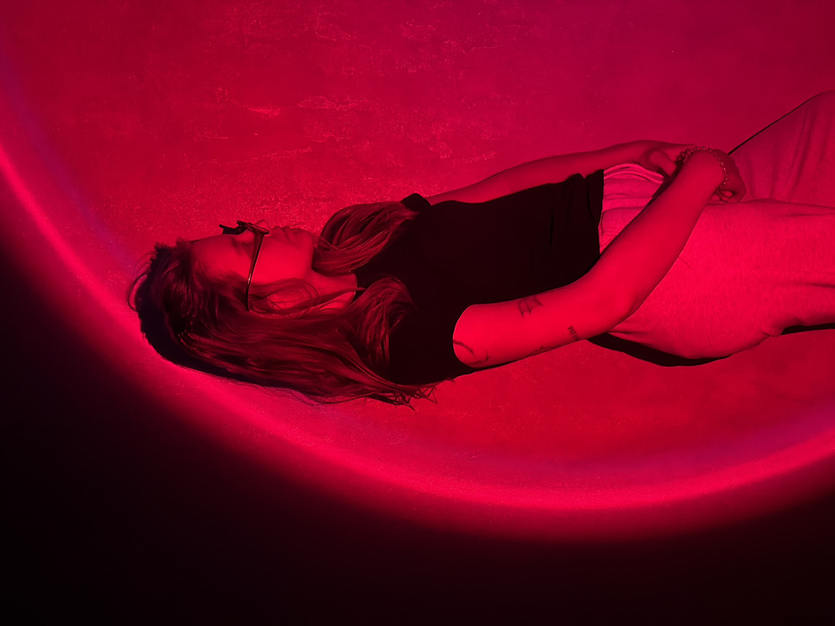 The image displays a young adult female standing in profile, facing right. She has long, light brown hair, dark-rimmed glasses, and a small dark hair accessory. She wears a dark, short-sleeved t-shirt and light-colored pants. A tattoo is visible on her left forearm and a bracelet on her right wrist. Her hands are clasped in front of her torso. The background is a textured wall, dramatically illuminated by a prominent, bright red semi-circular light projection that engulfs the subject and the wall in red light, with the far left portion of the image remaining dark. The specific location within Krasnodar, Russia, is not discernable from the visual information.