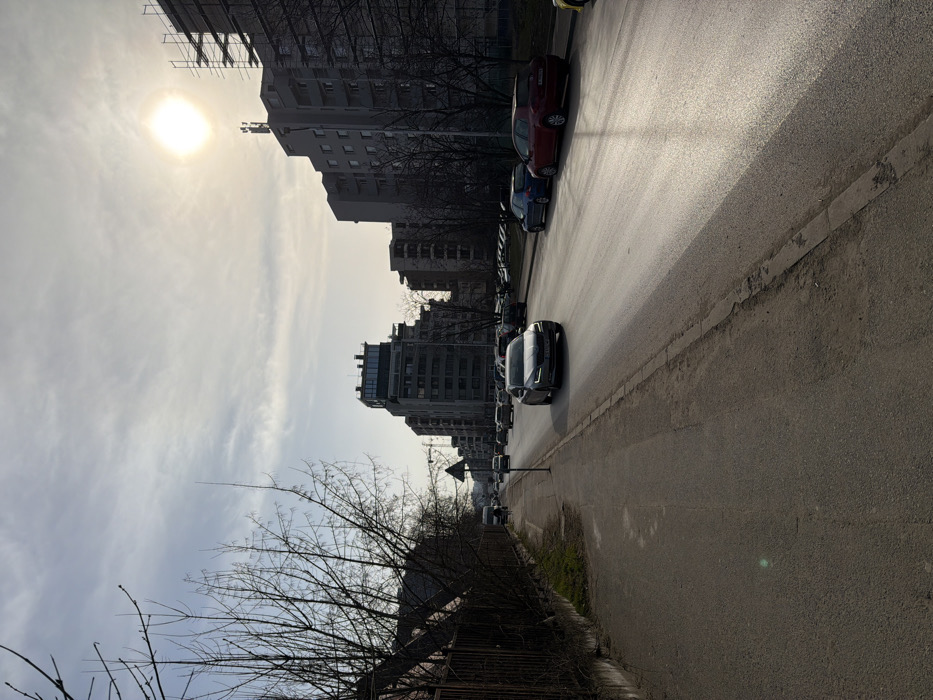 The image displays an urban street scene in Sofia, Bulgaria, characterized by a multi-lane asphalt road on a sunny day with scattered high clouds. The perspective is from a paved sidewalk on the left, which features a dark metal fence bordering bare-branched trees and sparse vegetation. A triangular road sign on a pole stands on the sidewalk's edge. On the road, a dark grey Skoda sedan, bearing Bulgarian license plate BG 8196 XT, is prominently positioned in the lane closest to the viewer, heading into the distance. Additional vehicles are visible in the background, both in motion and parked along the right curb; these include a blue and a red hatchback. The background is dominated by multi-story, grey concrete apartment buildings lining both sides of the street. One building on the far right exhibits scaffolding along its facade, indicative of construction or renovation. Another building's rooftop features communication antennas. The sun, a bright point of glare, is visible in the upper right portion of the sky, casting distinct shadows across the sun-drenched road. A solitary pedestrian is faintly visible walking on the distant left sidewalk. No other individuals or specific interactions are discernible.