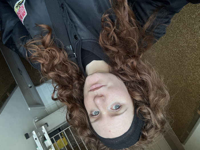 The image displays a female individual, estimated to be in her 20s or 30s, positioned for a selfie within an indoor building in Suresnes, France. She has fair skin with visible freckles across her nose and cheeks, blue eyes, and long, curly, auburn hair. A black mesh-style headband secures her hair. A small, gold-colored hoop piercing is present in her left nostril. She wears a black ribbed undergarment beneath a black bomber jacket. A patch with red, yellow, and black elements, partially reading "CLUB...", is visible on the right side of her jacket. A black strap, consistent with a bag, crosses her left shoulder. The background indicates an interior hallway or stairwell. The floor is covered with a textured, light brown material. Walls are light-colored. Visible in the upper right is a metal railing, a white wall, and a folded metallic object with yellow components, possibly a step ladder or cleaning cart, positioned on an upper landing or shelf. A dark metallic cabinet or door is also discernible against the wall.