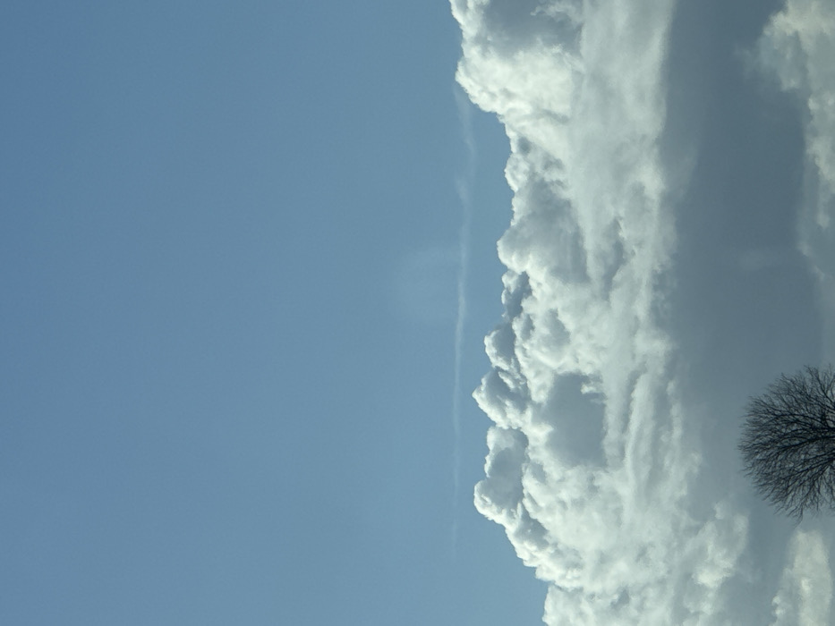 The image depicts a sky view above the city of Geispolsheim, France. The upper two-thirds of the frame consist of a clear, light blue sky. Within this blue sky, positioned centrally and slightly to the left, a faint, translucent, arc-shaped atmospheric optical phenomenon, possibly a fragment of a halo, is visible. The lower third of the image is dominated by a dense bank of cumulus clouds, stretching horizontally across the scene. The cloud tops are bright white and sharply defined, indicating strong illumination, while the lower portions appear in varying shades of grey, suggesting depth and shadow. In the bottom left quadrant, the upper canopy and intricate bare branches of a leafless deciduous tree are present, partially silhouetted against the darker cloud mass. No people, discernible actions, or direct interactions are visible.