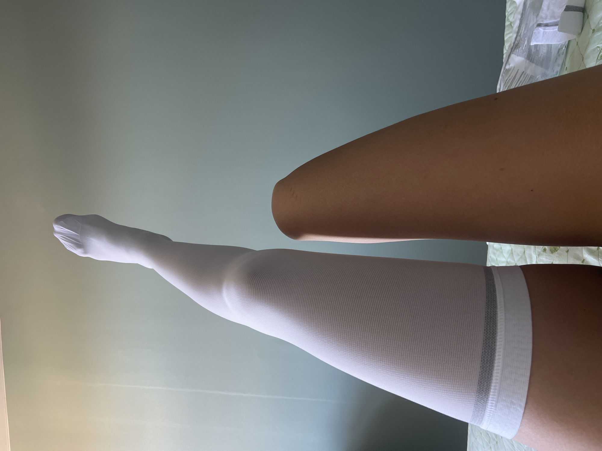 two legs, one bare and one wearing a white compression stocking. The leg with the stocking is extended upwards, while the bare leg is positioned horizontally above it. The location is unknown and not related to the city of Krasnoyarsk, Russia. The background is a plain wall with varying shades of color. A partially visible package is in the upper right corner of the image.