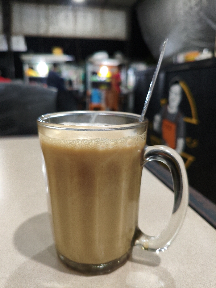 The image displays a clear glass mug containing a light brown, frothy beverage, possibly milky coffee or tea, with a silver-colored spoon inserted vertically into the drink. The mug rests on a light, solid-colored surface, likely a tabletop. In the blurred background, several brightly lit food stalls or vendor carts are visible, typical of an outdoor or semi-outdoor eatery. Blurred figures of individuals, including one wearing an orange top, are discernible among the stalls. To the right of the mug, a dark panel features a partial, faded graphic depicting a person's upper body in monochrome with an orange shirt, alongside a yellow, arched design. The scene is located in an eatery or food stall area within Mns Alue, Indonesia.