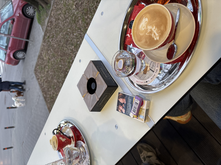 An overhead-angle image depicts a cafe terrace scene overlooking a street in Stara Zagora, Bulgaria. In the immediate foreground, the viewer's legs are visible, clothed in blue jeans with sneakers on the left foot and a brown/orange shoe on the right. The white tabletop occupies the mid-ground. On the right, a silver tray holds a red-rimmed white cup containing a cappuccino with distinct latte art, a small silver spoon on its saucer, and a glass of water. Several red packets of "Zuccarini" sugar are also on this tray, along with a circular coaster partially obscured by the glass. Centrally located on the table is a square, black and beige Dunhill-branded ashtray. To the left of the ashtray, a white pack of "ONE" cigarettes, featuring a health warning with two women on the packaging and Bulgarian text, rests beside a purple disposable lighter. Further left on the table, another silver tray holds a red espresso cup with a red saucer and a small glass of water, accompanied by a coaster bearing the text "Adien Melior." Beyond the table, a street scene unfolds. A man, partially visible, walks two dogs on leashes; one dog is white and fluffy, the other is smaller and brown. The pavement features three black bollards. A red station wagon car is parked on the street. To the right of the street, a patch of brown, sparse ground cover is visible, indicative of dormant vegetation.