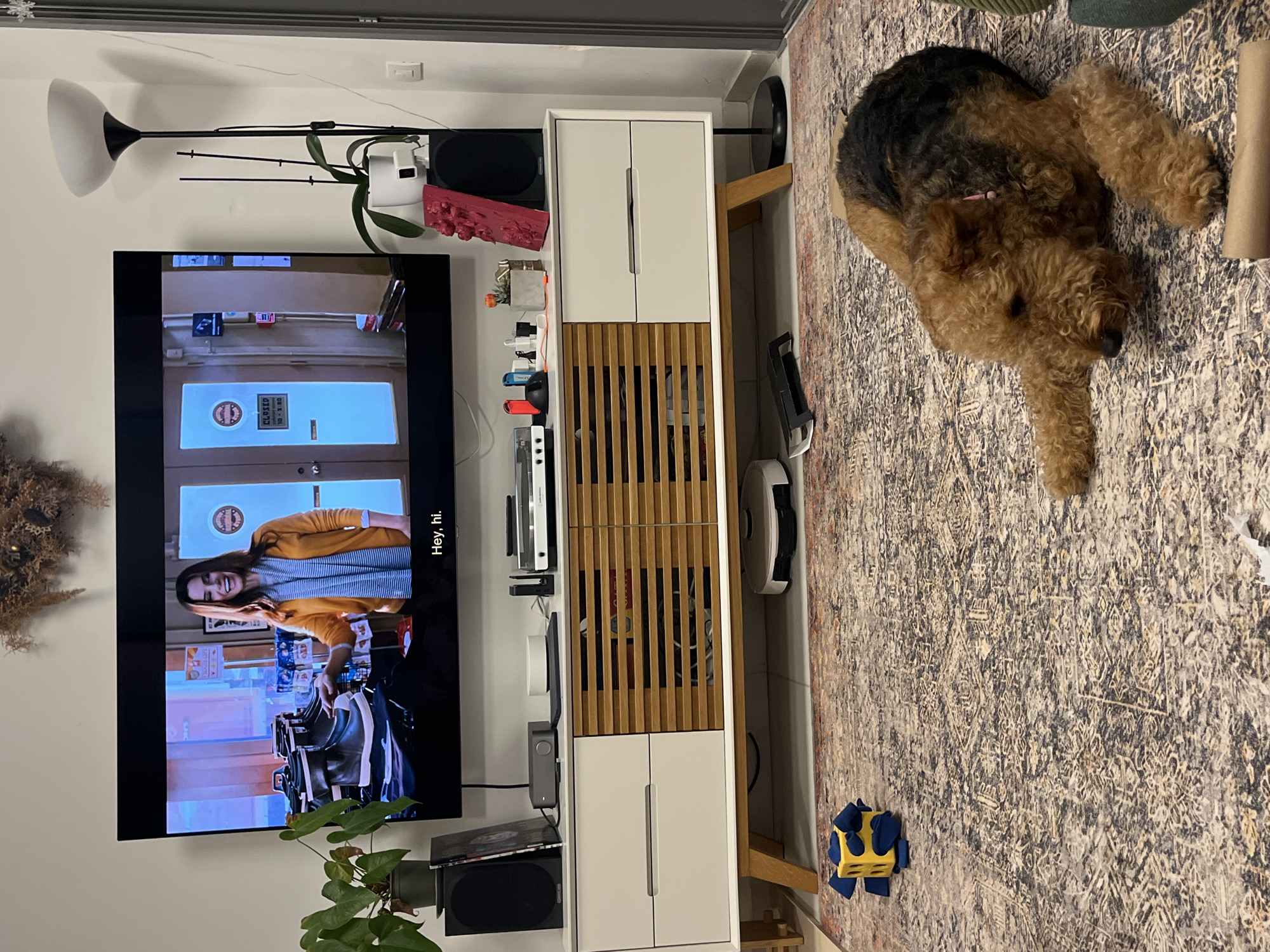 The scene depicts an interior living space in an apartment located in Ramat Gan, Israel. A large flat-screen television is centrally mounted on a white wall, displaying a female individual (identified as actress Sandra Bullock) in a yellow cardigan and striped scarf, gesturing towards a display of boots within what appears to be a retail setting. The subtitle "Hey, hi." is visible at the bottom right of the screen. A dark, dried botanical arrangement hangs on the wall above the television. Below the television, a modern media console with a light wood frame, white drawers on the left, and slatted wooden doors in the center and right spans the width of the display. On the console, from left to right, are a black speaker, a green potted plant (Anthurium), a gray audio device, a white circular smart speaker, various charging cables and electronics, two Nintendo Switch Joy-Cons (red and blue), a small potted succulent, a decorative red textured object, and another black speaker. A tall, black floor lamp with a white bowl-shaped shade stands to the right of the console, adjacent to a white-potted orchid plant. The floor is covered by an ornate, patterned area rug. In the foreground, an Airedale Terrier with brown and black curly fur and a pink collar lies prone on the rug, facing left. To the left of the dog, a yellow fabric cube toy with blue fabric elements is present. Near the dog's paws, a piece of crumpled brown paper or cardboard tube is visible. A white robot vacuum cleaner is parked under the right section of the media console. A light switch is mounted on the white wall to the far right.