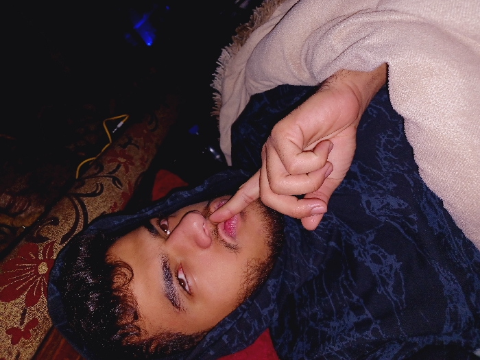 A young man with curly dark hair and a beard is lying down, facing the camera. He's wearing a hooded top patterned with dark blue. His right hand is raised to his face, with his index finger seemingly touching his lips. A beige blanket or towel drapes over part of his body. The background is dark, with a patterned surface visible to the left and some indistinct shapes and cords in the upper left corner.