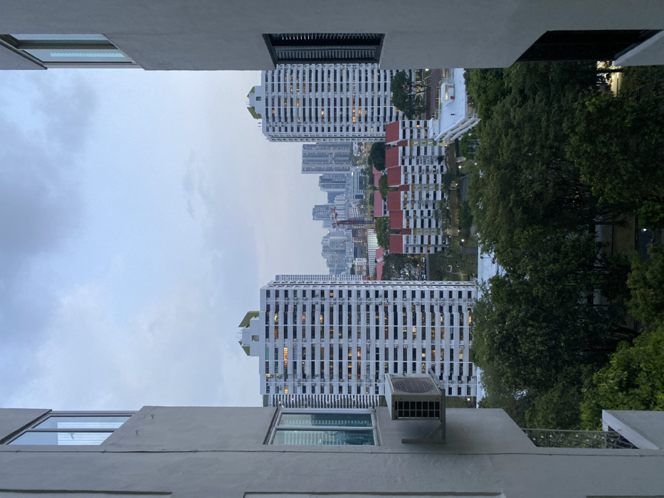 The image depicts an urban residential landscape in Singapore during dusk or early evening, viewed from a high vantage point between two light-colored, multi-story buildings that frame the scene