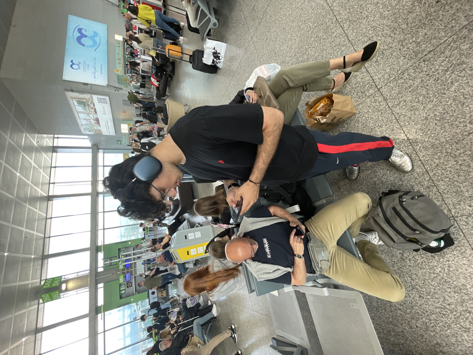 The image captures the scene of a young man with headphones on and a black t-shirt, holding a smartphone and looking down at it. He is sitting in a waiting area of Málaga Airport, Spain (latitude: 36.678, longitude: -4.494). He is sitting in a chair with a woman sitting to his right, who is wearing khaki pants and has her feet up on another chair, while looking down at her smartphone. To his left is a man in a black t-shirt and beige pants, also looking down at his smartphone. All three individuals appear to be engrossed in their respective devices, with the man on the right having his headphones on. Behind them, there is a bustling waiting area with people sitting and standing around, many of whom are also looking at their phones or electronic devices. The environment is bright and well-lit, with several signs and advertisements displayed on the walls.