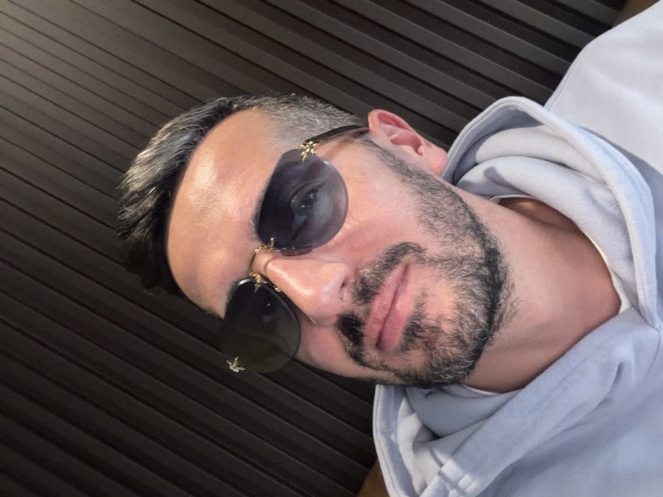 A male individual is depicted in a close-up, upward-angle portrait, occupying the lower two-thirds of the frame. He has short dark hair with visible graying at the temples, dark eyebrows, and a short beard and mustache. He is wearing rimless sunglasses with dark, possibly graduated, lenses and gold-colored bridge and temple accents that appear to have a decorative element, possibly a small animal or crest, on the outer corners. The subject is wearing a light blue hooded sweatshirt over a white undershirt, visible at the neckline. His head is slightly tilted to his left, and he is looking directly towards the camera. The background consists of dark, vertically oriented wooden or synthetic slats, suggesting an indoor environment. The specific location within Sofia, Bulgaria, cannot be determined from the visual information presented.