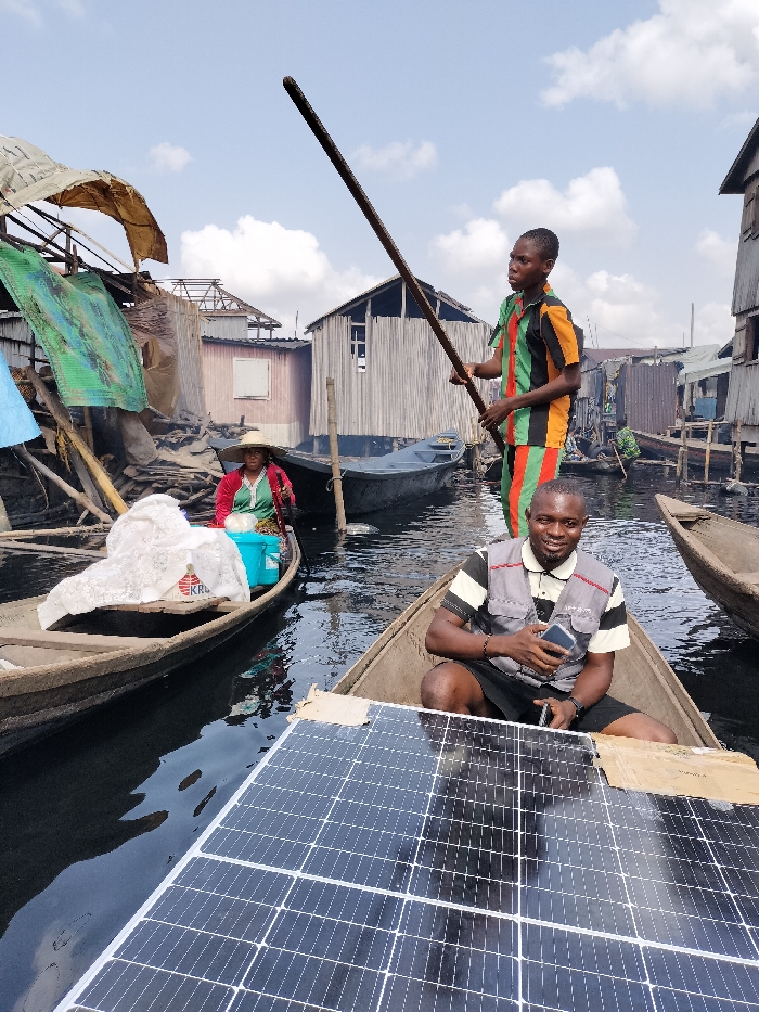 The image depicts a waterways scene in Makoko, Lagos, Nigeria, characterized by stilt housing and multiple wooden canoes. In the immediate foreground, a rectangular, dark-paneled solar panel is positioned horizontally within a wooden canoe, partially secured with brown cardboard tape. Seated behind the solar panel in the same canoe is a male individual, facing the camera and smiling. He wears a striped polo shirt, a grey and black utility vest with red trim, and black shorts, holding a dark smartphone in his left hand. Directly behind this canoe, a second wooden canoe moves rightward. A young male, standing, propels this boat using a long, dark wooden pole. He wears a vertically striped shirt and trousers in orange, green, and black. Further back, a third wooden canoe contains a seated female individual wearing a wide-brimmed straw hat and a red jacket over a green garment. A light blue container and a white bundled object are visible within her boat. The background features numerous informal stilt structures and houses, constructed from wood and corrugated metal, lining the dark water. Some buildings show exposed framing and makeshift roofs. The sky above is light blue with scattered white clouds.