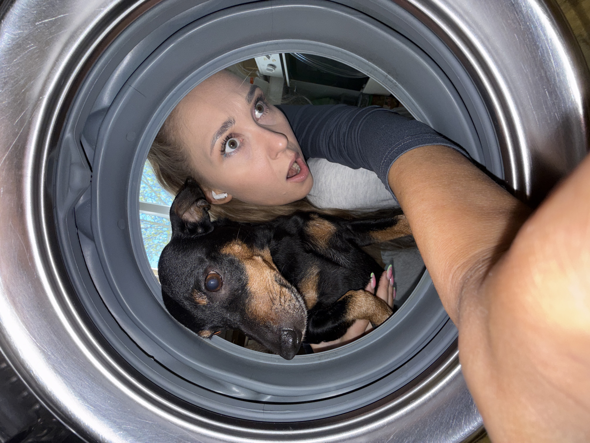 A woman and a small dog are positioned inside the open door of a front-loading washing machine. The woman, who has fair skin and blonde hair, is wearing a grey long-sleeved shirt and appears to be looking upwards with a surprised or alarmed expression. She has an AirPod in her ear. She is holding the dog, which is a small, black and brown breed resembling a dachshund. The washing machine is predominantly grey and silver, with a rubber seal visible around the door opening. The location is the city of Chaikovsky, Russia.