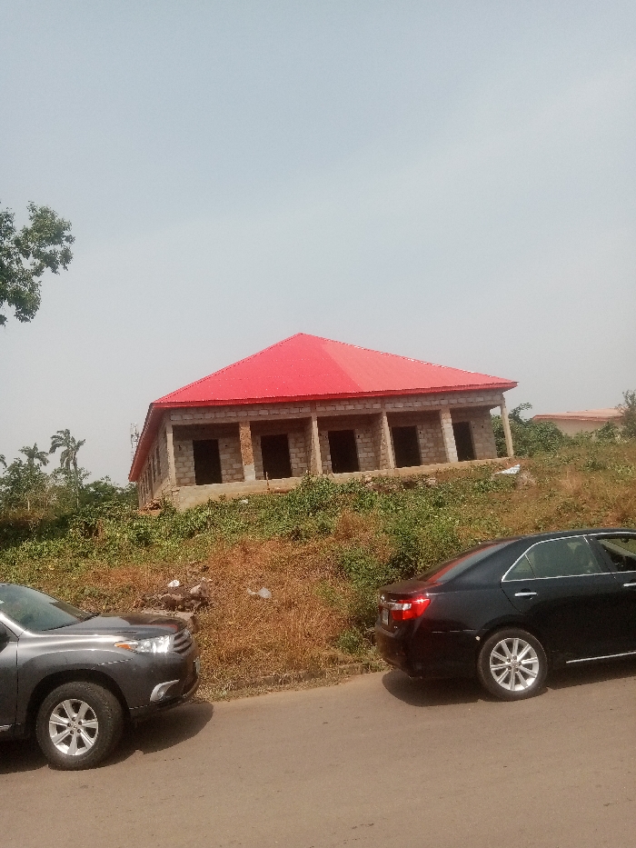 This image depicts an outdoor scene in Links Reservation, Nigeria, under clear daylight. The central focus is an unfinished, single-story building positioned on an elevated, unkempt plot of land. The structure is constructed from light-colored concrete blocks and features a striking red pyramidal metal roof. Multiple open, dark apertures suggest doorways or windows along its visible facade. Behind this building and further up the gentle incline, a smaller, tan-colored building with a darker roof is partially visible. The immediate ground surrounding the main building is covered with a mixture of green foliage and dry, brown grass. Several green-leafed trees, including identifiable palm trees, are present on the left side of the frame. In the foreground, a paved road extends horizontally. Two vehicles are parked on this road: the front portion of a dark gray SUV is visible on the left, and the rear three-quarters of a black sedan is visible on the right. No individuals are present in the scene.
