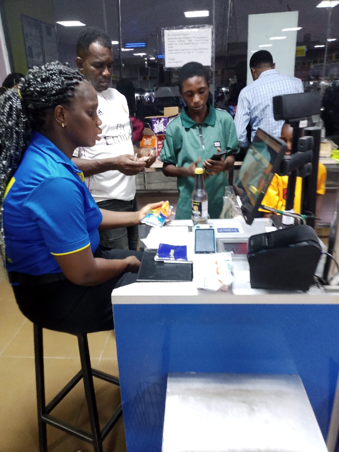 A store cashier sits on a high stool behind a blue and white counter, processing a customer's purchase. The customer, wearing a white soccer jersey, holds out his hands, seemingly counting money. Another person in a green polo shirt stands nearby, looking at a phone. The counter holds a bottle of liquid, payment devices, and a receipt printer. A child in a yellow shirt is partially visible behind the counter's display screen. Other customers are blurred in the background.