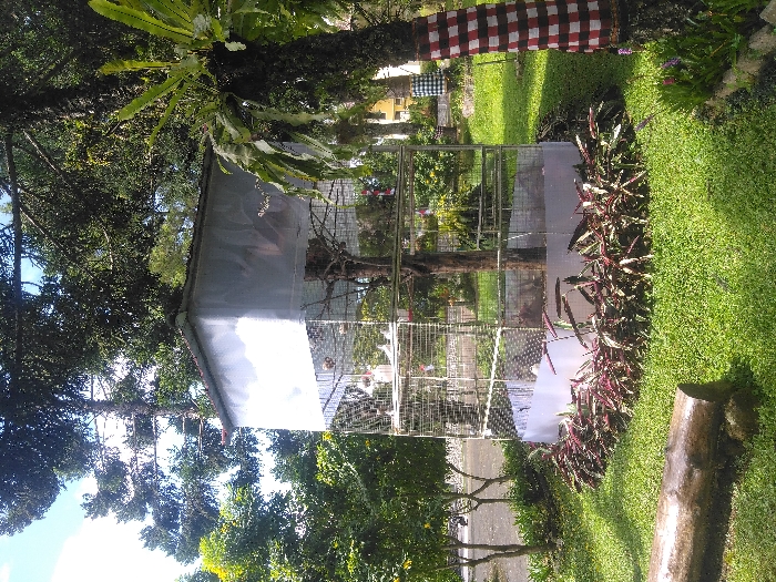 The image depicts an outdoor garden or park setting in Cipanas, Indonesia, under bright daylight