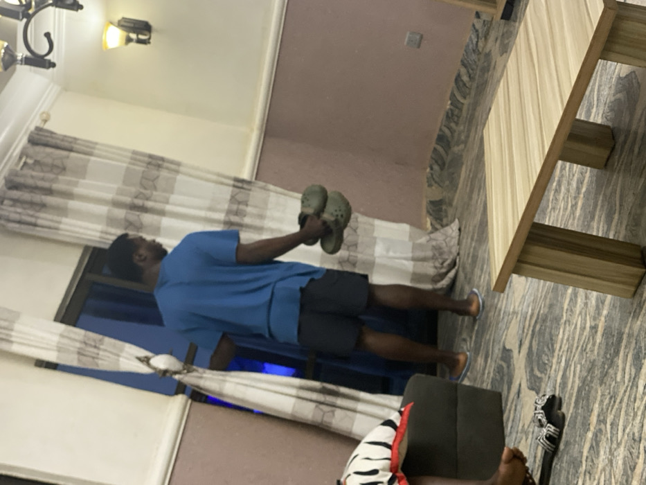 A man in a blue shirt and black shorts holds up a pair of green Crocs. He is standing in a room with beige walls, grey and white curtains, and a grey marble-patterned floor. A dark window and furniture are also visible.