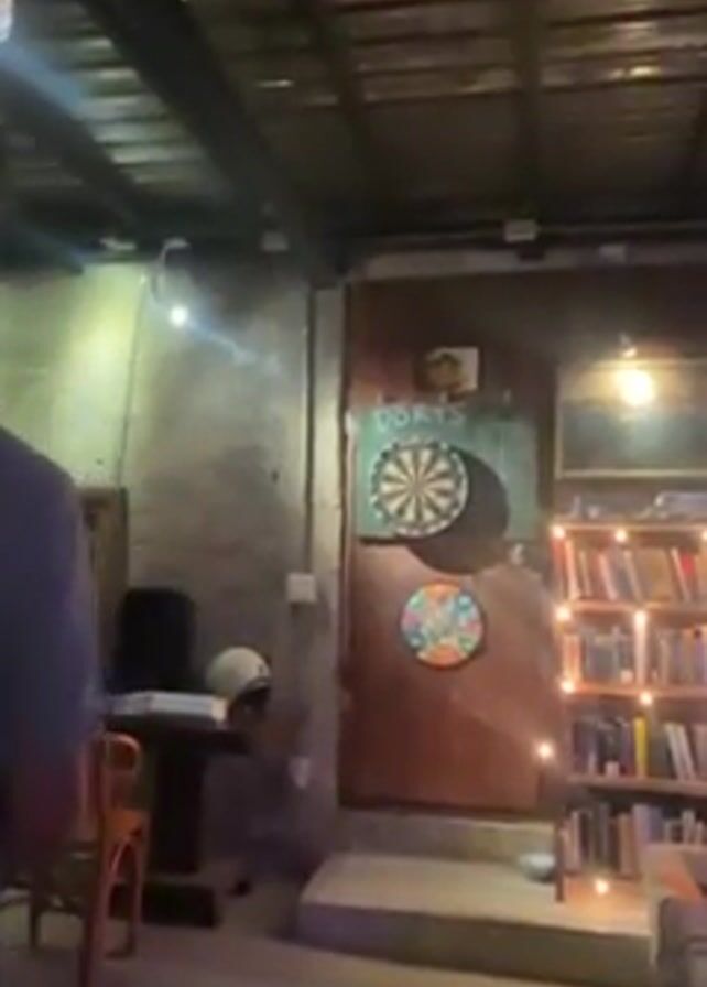 A man throws a dart at a dartboard. The dartboard is mounted on a wooden door next to a bookcase filled with books and lit by string lights. The setting appears to be a bar or game room with a rustic, industrial vibe.