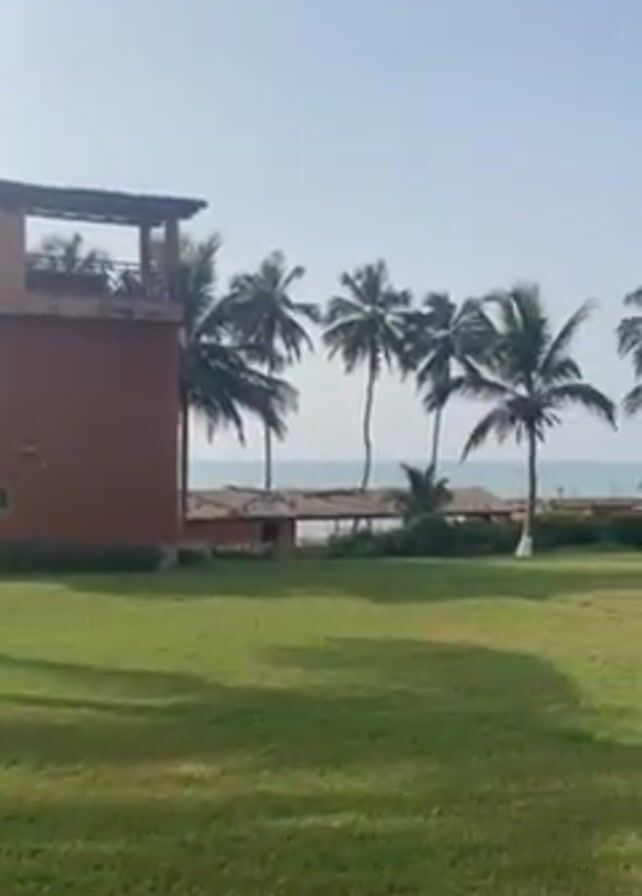 coastal scene on a sunny day. The foreground features a large, green lawn. To the left of the frame is a two-story red building with a rooftop deck. Palm trees are scattered across the scene. The background shows a sandy beach and the ocean, with a few small buildings and people visible in the distance. The camera slowly pans to the right, revealing a building with a thatched roof and an open-air structure. The overall impression is of a tropical resort or recreational area.