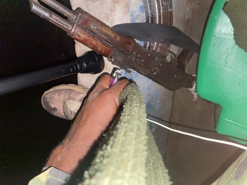 The image captures a close-up, downward-angled view of a scene in Zaki Biam, Nigeria, under low-light conditions. A dark-skinned arm, wearing a camouflage-patterned sleeve, extends from the upper left. A right hand holds a purple disposable lighter. Adjacent to this, a foot clad in a camouflage-patterned tactical boot is visible. A black, cylindrical tactical flashlight stands upright on a light-colored, possibly concrete or stone, surface. To its right, a brown and black AK-pattern rifle, equipped with a black sling, rests, leaning against a blue-rimmed cylindrical object. A textured, dark green textile material hangs into the frame from the left, with a thin white cable running below it. A portion of a green plastic object is visible in the lower right foreground. The overall environment appears utilitarian, with rough, light-colored surfaces.