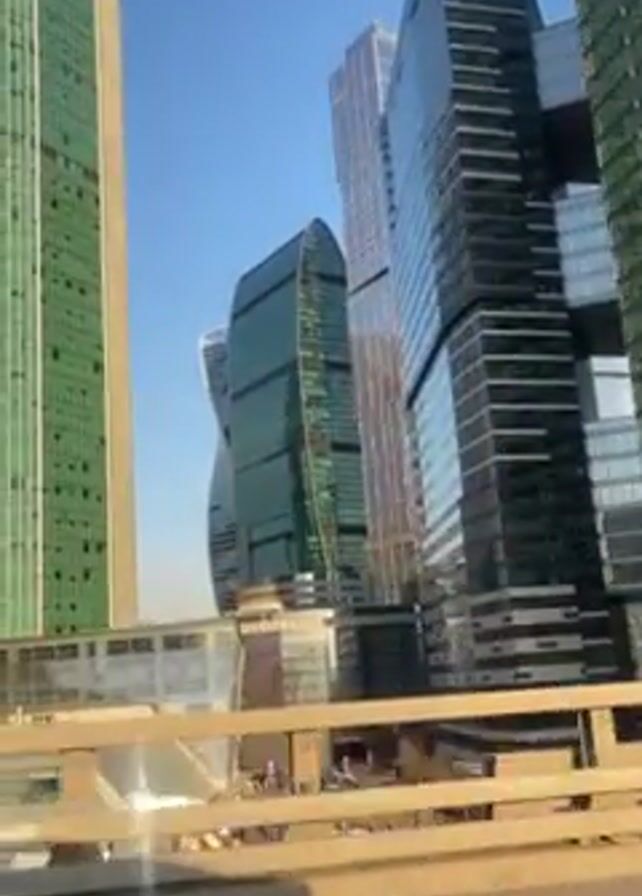 The video depicts a series of modern skyscrapers, captured from a low-angle, moving perspective