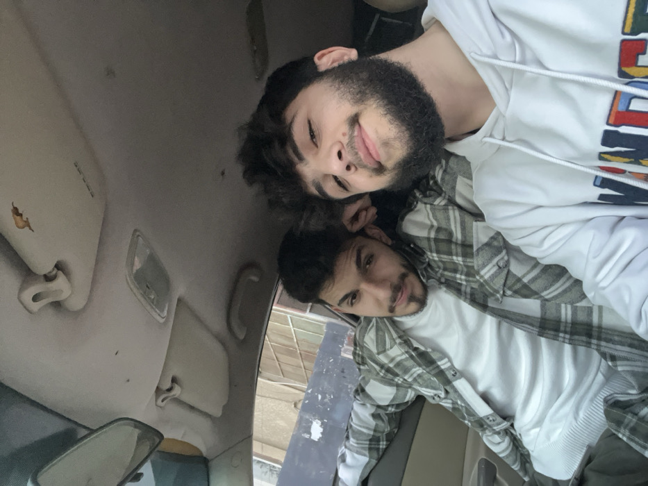 Two young men are photographed from a low angle inside a car. The man closest to the camera wears a white t-shirt under a green and grey plaid flannel shirt. Beside him, the other man sports a white hoodie with colorful lettering. Both have dark hair and beards. The car's interior includes sun visors, a rearview mirror, and the ceiling. Outside the window, a building is visible.