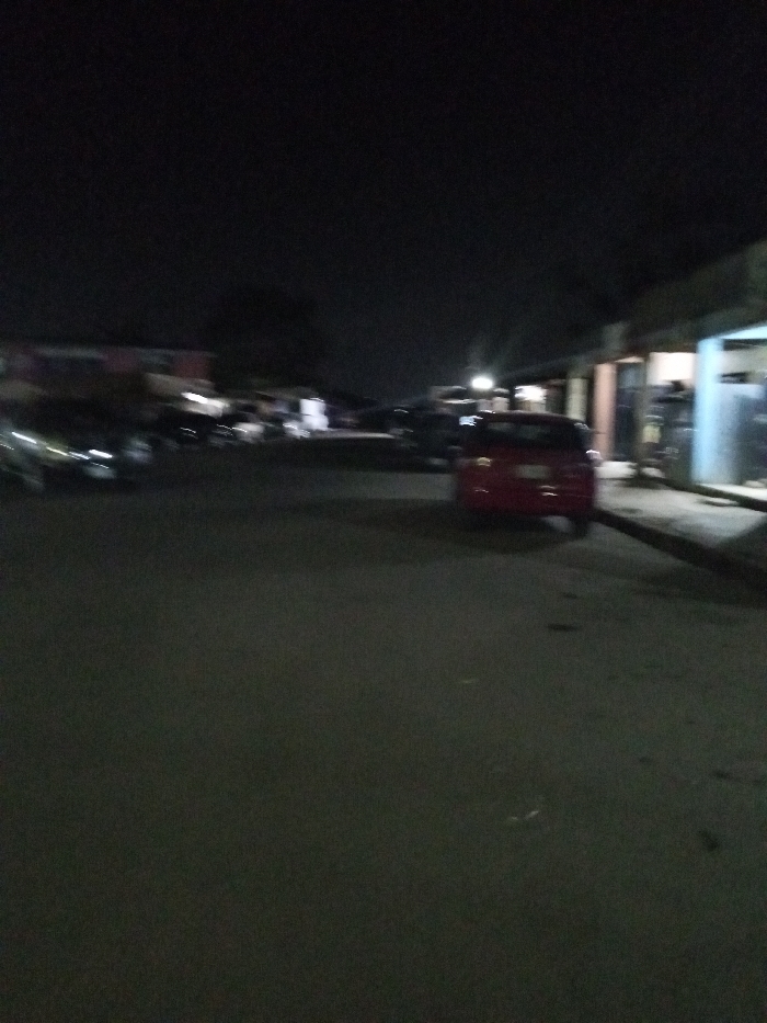 A street scene at night features parked cars lining both sides. A red car is visible on the right. Buildings are present on the right side of the road with some open doors. Street lights provide some illumination. The road surface is dark, with noticeable texture. The overall atmosphere is dark and indistinct.