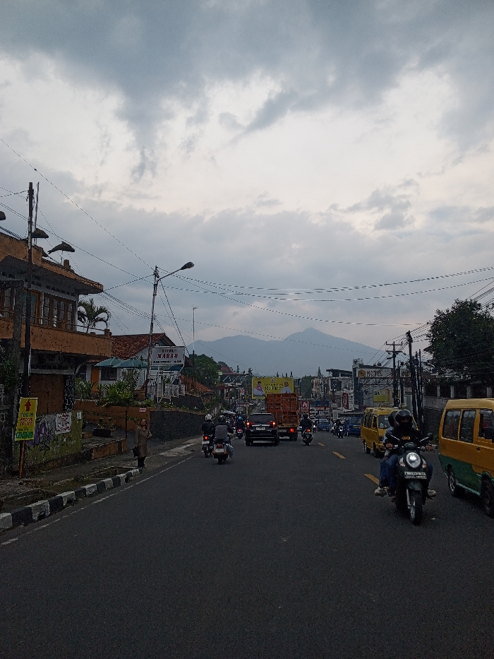 The image depicts a busy street scene in the city of Kheda, India, situated within a mountainous or hilly region under a heavily overcast sky