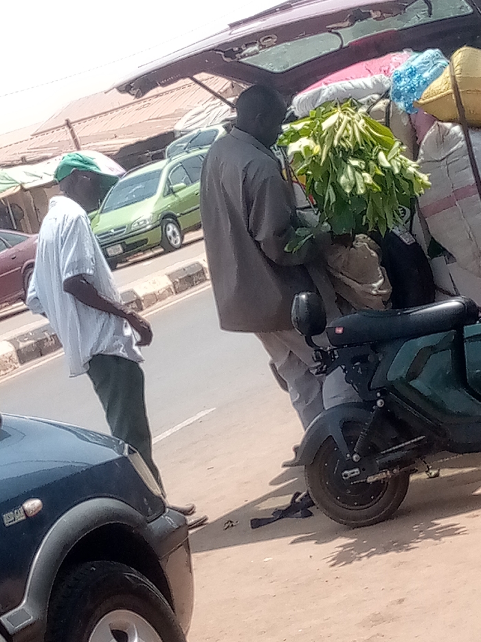 The scene depicts a daylight street or roadside market in Kafanchan B, Nigeria
