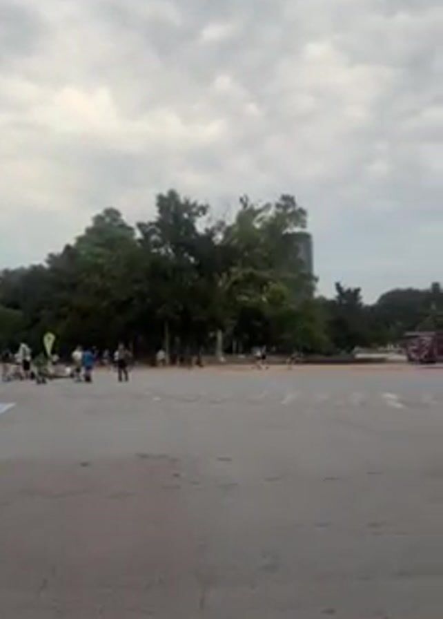 public park area under a cloudy sky. The foreground consists of a large, paved area with visible cracks and markings. In the middle ground, there's a line of trees and a body of water, with people strolling and cycling along the paths. In the background, there are high-rise buildings visible above the treeline. There are people moving around the paved area as well.