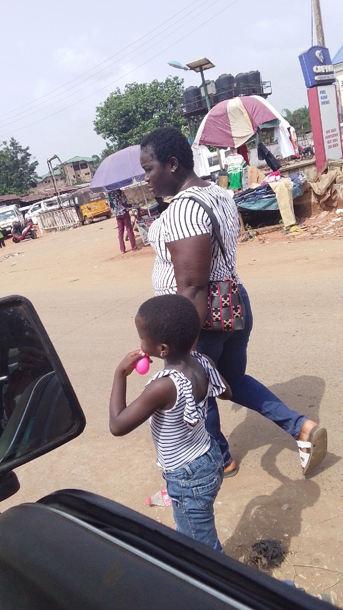An adult female and a young girl walk along a reddish-brown unpaved road in Igbo Ukwu, Nigeria, under an overcast sky. The female, with dark short hair, wears a white and black striped short-sleeved top, dark blue jeans, and white sandals on her left foot, with a patterned black and pink shoulder bag on her right side. The girl, positioned slightly in front and to the left of the female, wears a white and black striped top with ruffled shoulders, blue jeans, and has a small earring in her left ear. She holds a pink spherical object to her mouth with her right hand. The scene is viewed from the perspective of a vehicle, with a black car mirror and frame visible in the immediate foreground on the left. In the mid-ground, a vibrant street market environment unfolds. On the left, multiple white vans or buses are parked alongside a yellow auto-rickshaw and a red scooter. A purple market umbrella is open on the left. On the right, a maroon and white striped market umbrella covers displayed clothes. Behind this, a tall utility pole structure supports solar panels and multiple black water tanks. Adjacent to this, a blue and red sign for "OPTIMUM COMPANY OIL" advertises "FUEL KERO DIESEL" and "MAX LUBRICATION." Buildings with green roofs are visible in the distant background, interspersed with trees. Debris, including a plastic bottle and a dark clump of material, lies on the unpaved road surface.