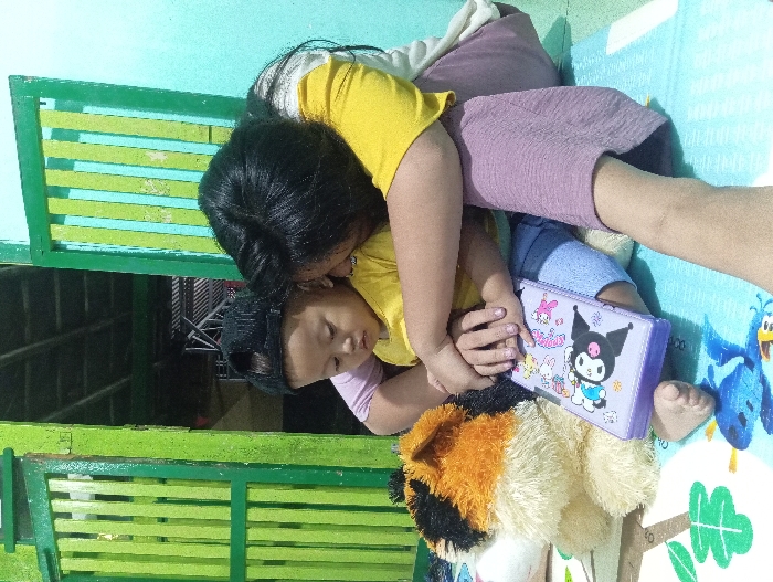 The scene depicts an indoor domestic environment located in Kecamatan Pati, Indonesia. Two individuals are present: an adult female and a young child. The adult, wearing a white and yellow top with light purple pants, is seated on a light blue and green patterned floor mat and is embracing the child from behind. The child, wearing a black baseball cap, a yellow shirt, and light blue shorts, is also seated on the mat, looking downwards, and holding a purple tablet or book case adorned with cartoon characters. To the immediate left of the child is a large, tri-colored (black, orange, white) stuffed animal. The background consists of a light blue wall on the right and two weathered green wooden door panels with vertical slats on the left.