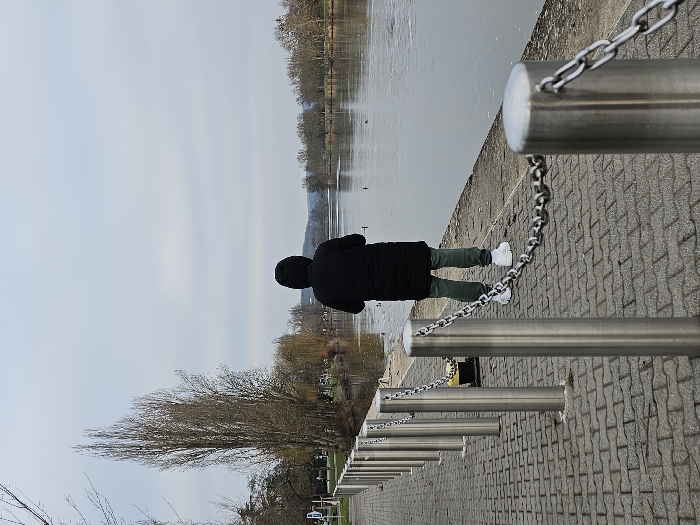 The image depicts an outdoor scene in Bech-Kleinmacher, Luxembourg, along a river promenade under an overcast sky. A single individual stands with their back to the camera on a paved path of grey interlocking bricks, facing a calm, grey-brown river. The individual is dressed in a black hooded long coat, dark green trousers, and white athletic shoes. A barrier of silver-colored cylindrical metal bollards connected by metal chains runs along the edge of the promenade, separating it from the riverbank. A black mooring cleat with a yellow top is visible at the river's edge, behind the barrier. Several waterfowl are present on the water's surface in the midground. The far bank of the river is lined with mostly bare deciduous trees, extending to the horizon where faint hills or structures are discernible under a uniformly light grey sky.