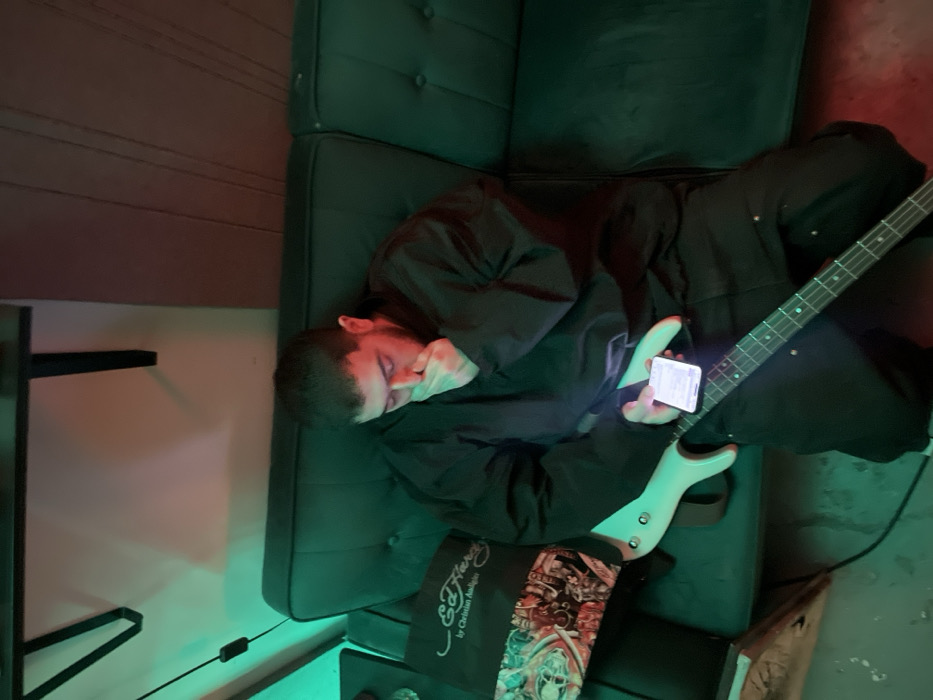 An adult male is seated on a dark, tufted couch under artificial lighting. He wears a dark long-sleeved garment and dark pants. His right hand covers his mouth and nose, while his left hand holds a white smartphone with its screen illuminated, displaying text. A pale green bass guitar rests across his lap. To his left, on the couch, is a black bag or pillow featuring an "Ed Hardy by Christian Audigier" logo and a multi-colored graphic design. The immediate environment is illuminated by a prominent green light source from the left and a warmer, reddish light on the right, casting distinct hues across the scene. The background includes a dark shelf or fixture on the upper left and what appears to be wooden paneling on the right wall. The specific location within the city of Toronto cannot be determined from the visual information provided in the image.